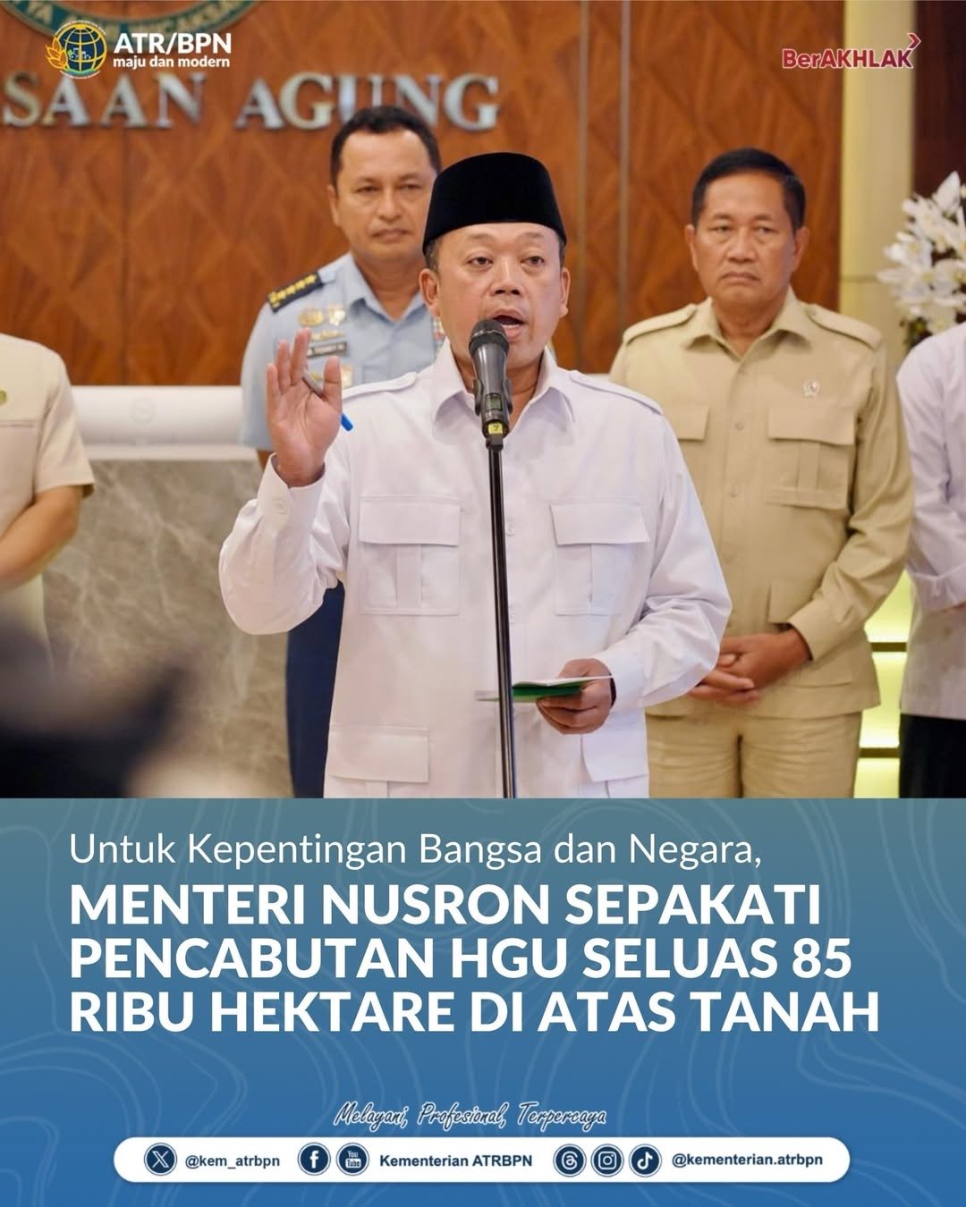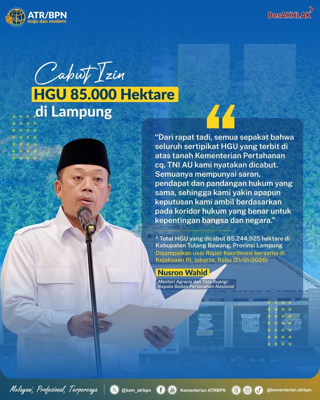 Jakarta, mediabusernrws.com, – Menteri ATR/BPN, Nusron Wahid, bersama Wakil Menteri Pertahanan dan pimpinan lembaga negara menyepakati pencabutan Hak Guna Usaha (HGU) seluas 85.244,925 hektare di Kabupaten Tulang Bawang, Provinsi Lampung,…