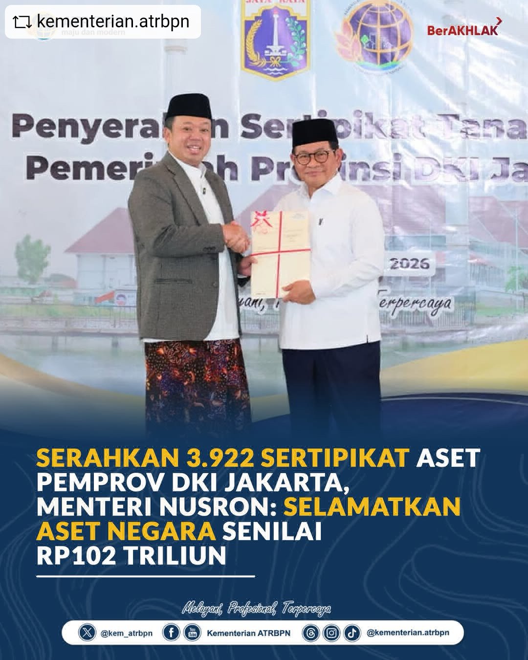 Serahkan 3.922 Sertipikat Aset Pemprov DKI Jakarta, Menteri Nusron: Selamatkan Aset Negara Senilai Rp102 Triliun