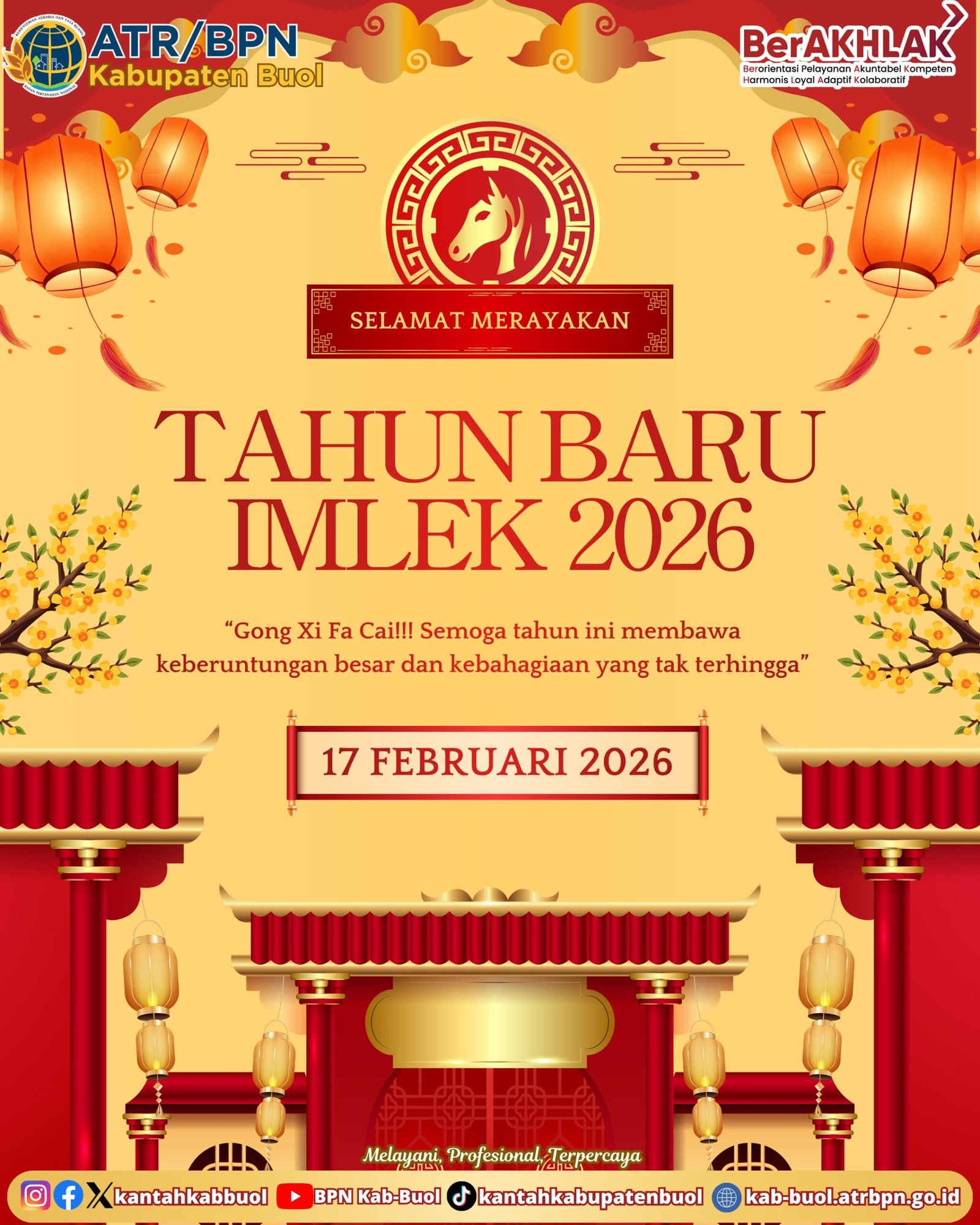 Buol, mediabusernews.com, – Segenap jajajaran kerja Kantor Pertanahan Kabupaten Buol mengucapkan Selamat Merayakan Tahun Baru Imlek 2577 Kongzili. Dalam momentum ini, mari jadikan sebagai sarana untuk mempererat toleransi antar umat…