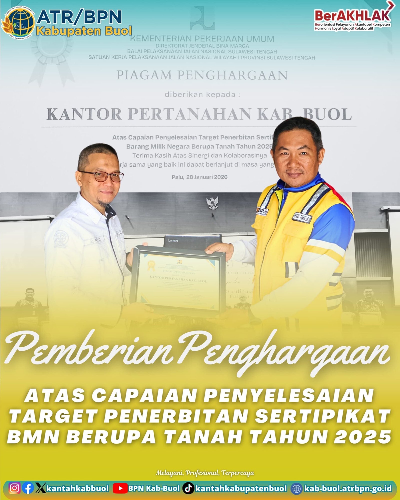 Buol, mediabusernews.com, – Kamis (26/02/2026) – Kantor Pertanahan Kabupaten Buol menerima penghargaan atas capaian Penyelesaian Target Penerbitan Sertipikat Barang Milik Negara (BMN) Berupa Tanah Tahun 2025. Penghargaan ini diberikan oleh…