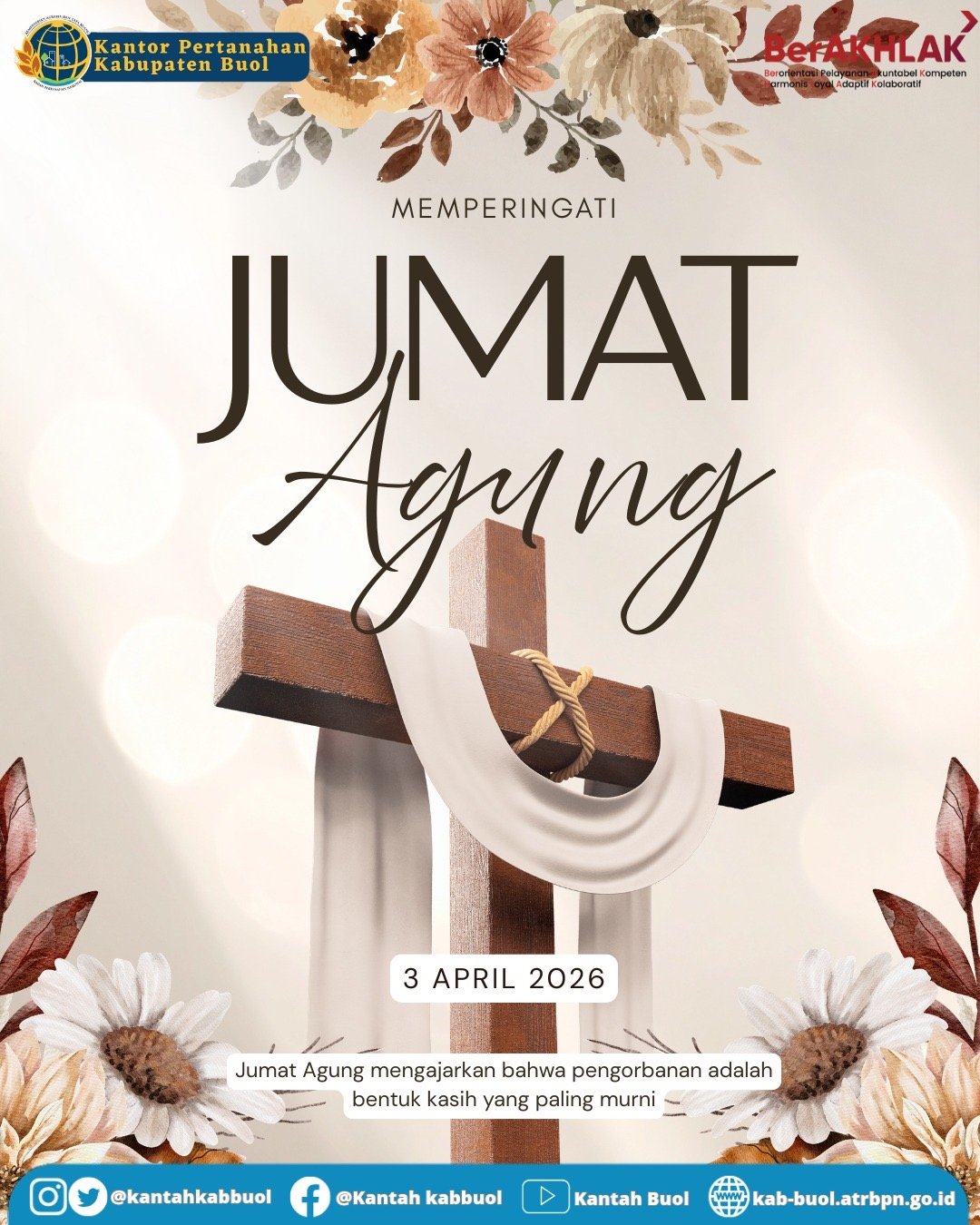 Segenap jajaran Kantor Pertanahan Kabupaten Buol mengucapkan Selamat Memperingati Jumat Agung 2026 Wafat Yesus Kristus.