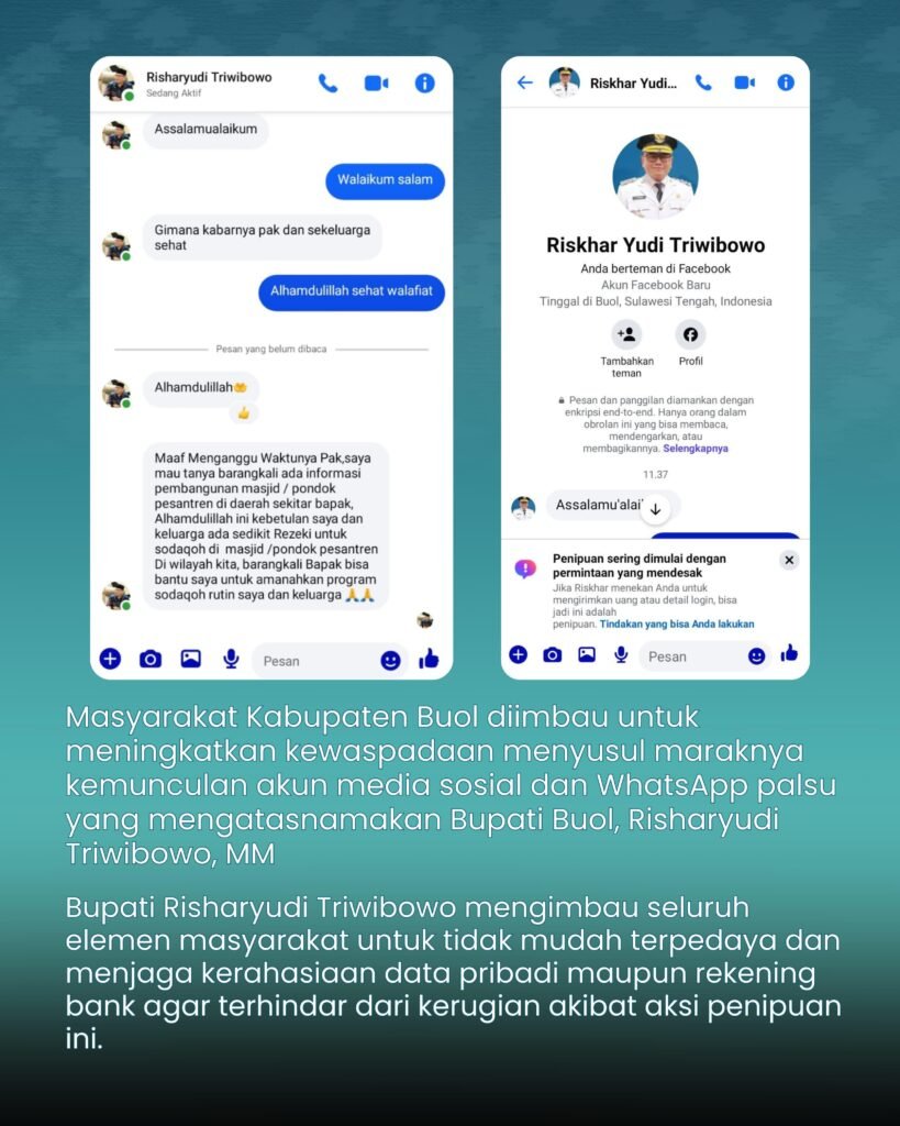 Buol, mediabusernews.com, – Bupati Buol H.Risharyudi Triwibowo Timumun,MM meminta Aparat Penegak Hukum(APH) khususnya jajaran Polres Buol untuk segra menyelidiki akun palsu yang mengatas namakan dirinya sebagai Bupati Buol, di mana dalam akun disebutkan bahwa Bupati Buol itu menawarkan sesuatu berupa sumbangan, ia menegaskan bahwa dirinya tidak melakukan hal tersebut karena bertentangan dengan hati nuraninya sebagai pelayan masyarakat dan postingan tersebut 100% adalah hoax, ujar Bowo Timumun sapaan akrabnya.