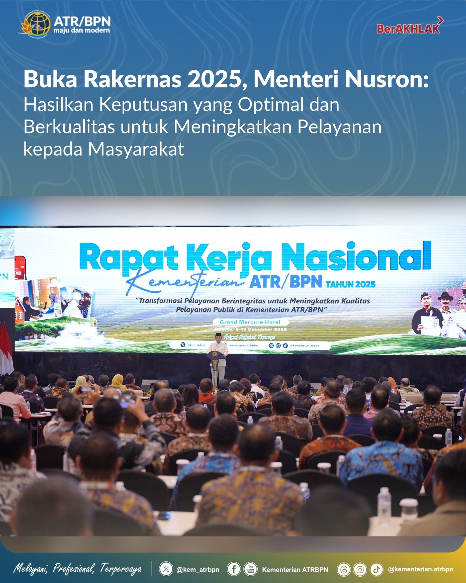 βRakernas ini kami nyatakan dibuka. Semoga bermanfaat dan menghasilkan keputusan-keputusan yang optimal dan berkualitas untuk meningkatkan pelayanan kita kepada masyarakat,β ujar Menteri Nusron dalam sambutannya, di Jakarta.