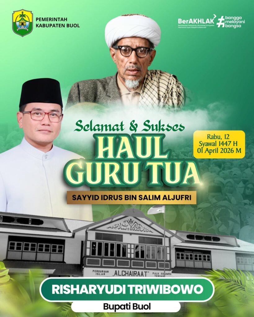 Palu, mediabusernews.com β Pelaksanaan Haul ke-58 Sayyid Idrus Bin Salim Al-Jufri atau yang dikenal sebagai Guru Tua berlangsung sukses dan penuh khidmat di kompleks Alkhairaat, Kota Palu, rabu (1/4/2026). Kegiatan tersebut dihadiri oleh Bupati Buol, H. Risharyudi Triwibowo Timumun, Gubernur Sulteng Anwar Hafid dan ribuan jamaah Alkhairat dari berbagai daerah yang memadati lokasi kegiatan.
