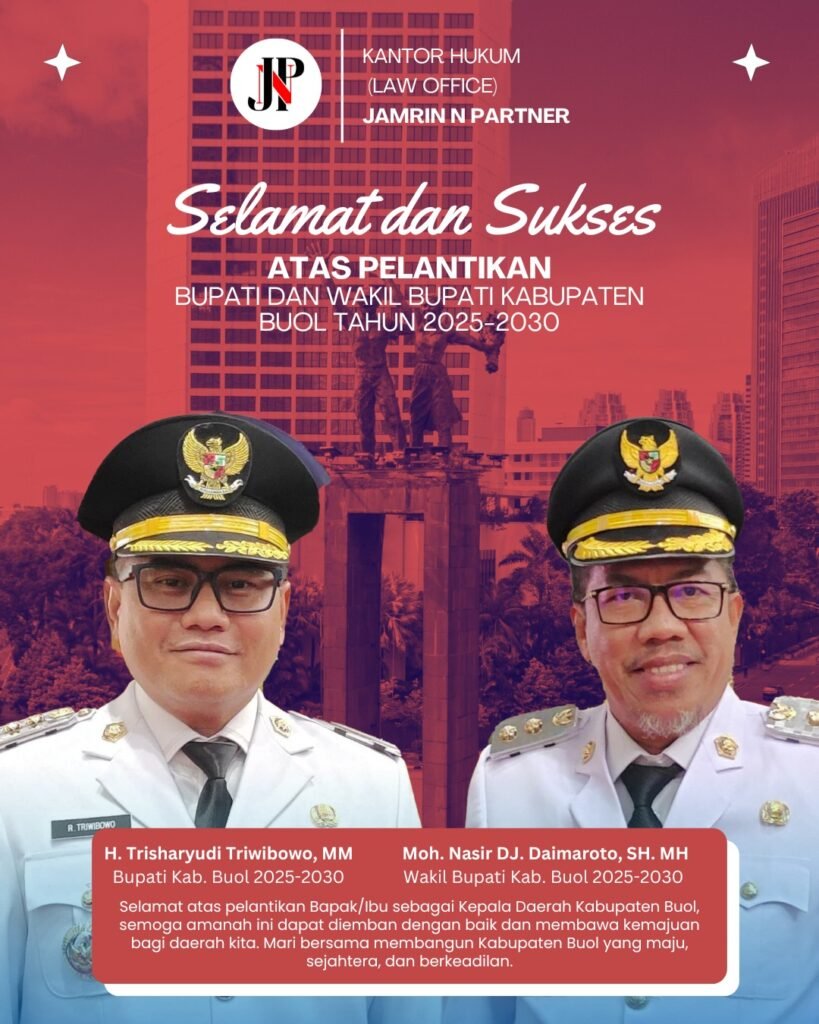 Bowo – Nasir sapaan kedua pejabat tersebut kini resmi menjalankan roda kepemerintahan di bumi Pogogul kabupaten Buol Berkah kurun waktu 5 tahun mendatang 2025 – 2030, pasangan ini di yakini dapat membawa perubahan kabupaten Buol secara signifikan, maju dan berkeadilan untuk semua, ujar Jamrin Zainas SH, MH yang juga salah seorang penasihat hukum(PH) kedua pejabat tersebut usai pelantikan kamis, 20/2/2025 di silang monas jakarta kepada media Buser News.com.