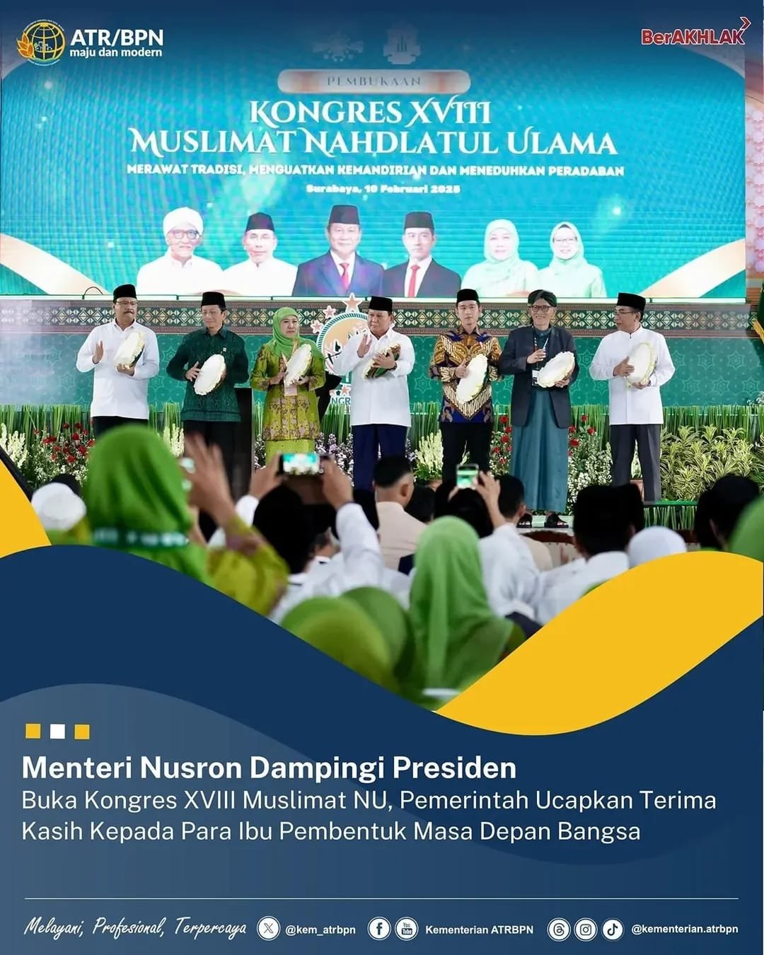 Jakarta, Media Busert News.com, – Menteri Agraria dan Tata Ruang/Kepala Badan Pertanahan Nasional (ATR/BPN) Nusron Wahid mendampingi Presiden Republik Indonesia, Prabowo Subianto, membuka Kongres XVIII Muslimat Nahdlatul Ulama (NU). Pada kesempatan ini Presiden mengucapkan terima kasih kepada Muslimat NU atas peran dan kontribusinya dalam menjaga persatuan serta mendukung kemajuan bangsa.