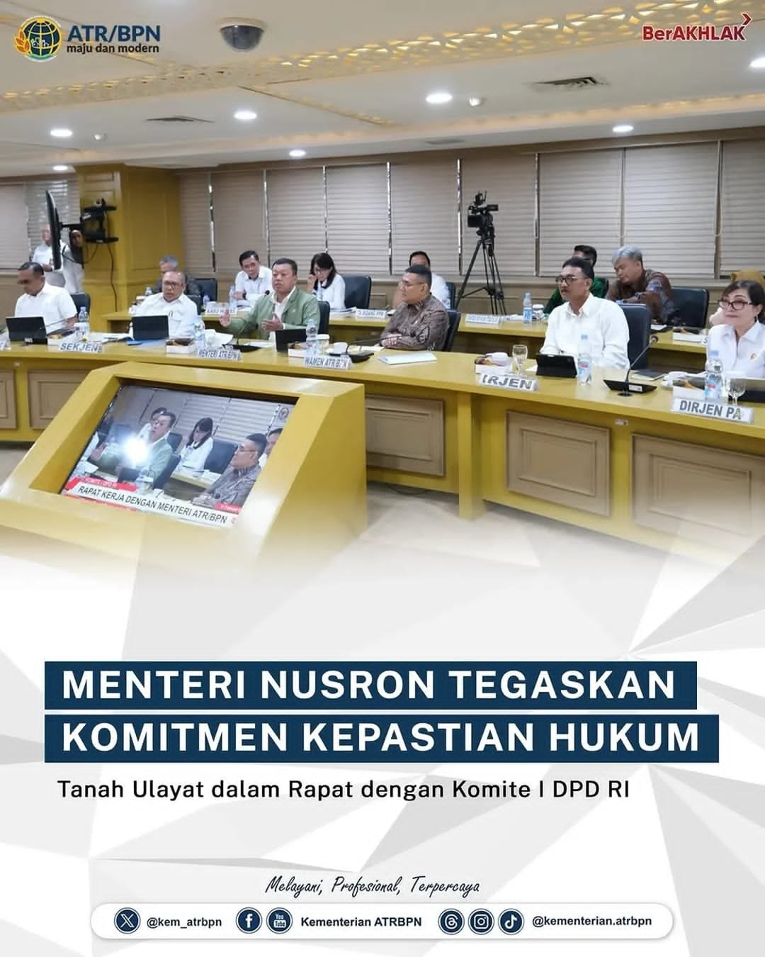 Jakarta, Media Buser News.com, – Menteri Agraria dan Tata Ruang/Kepala Badan Pertanahan Nasional (ATR/BPN), Nusron Wahid, menegaskan komitmen pemerintah dalam memberikan kepastian hukum atas tanah ulayat. Dalam rapat dengan Komite I Dewan Perwakilan Daerah Republik Indonesia (DPD RI), pada Selasa (11/02/2025), ia menekankan pentingnya pendaftaran tanah adat untuk menghindari konflik pertanahan di masa depan.