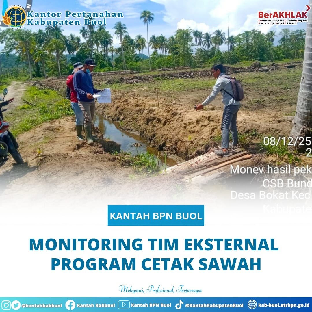 Buol, mediabusernews. com, – Selasa (9/12/2025) – Tim Pengawas Eksternal Program Cetak Sawah Kabupaten Buol yang diwakili oleh Agus Wisudawan Saputra β Penata Layanan Operasional pada Seksi Penetapan Hak dan Pendaftaran Tanah Kantah Buol. Kegiatan ini merupakan bagian dari Asta Cita Presiden Prabowo Subianto dalam memperkuat ketahanan pangan nasional melalui perluasan lahan produktif.