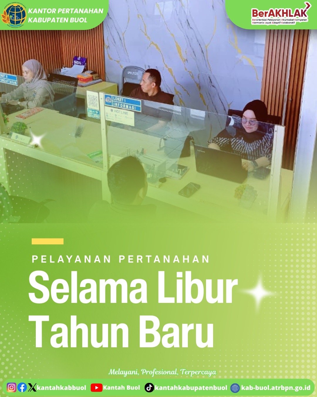 Buol, mediabusernews.com, – βKantor Pertanahan Kabupaten Buol melaksanakan pelayanan pertanahan selama Cuti Bersama Tahun Baru 2026 pada tanggal 1 Januari 2026. Pembukaan pelayanan pertanahan ini merupakan komitmen Kantor Pertanahan Kabupaten Buol dalam memberikan pelayanan kepada masyarakat, walau bertepatan dengan hari libur nasional.