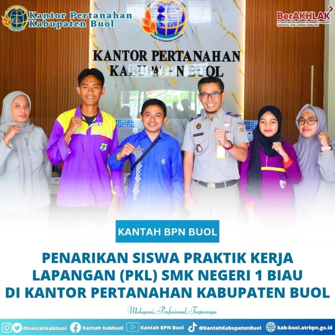 βSelama 4 bulan, siswa-siswi SMK Negeri 1 Biau telah melaksanakan PKL di Kantor Pertanahan Kabupaten Buol. Kegiatan ini menjadi sarana pembelajaran langsung di dunia kerja yang memberikan pengalaman berharga dalam bidang pertanahan dan administrasi perkantoran.