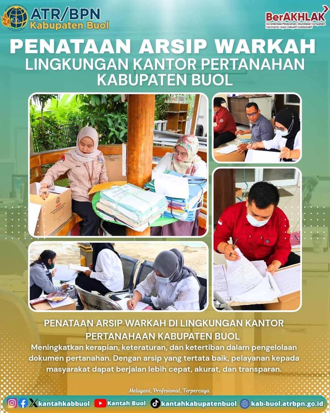 Buol, mediabusernews.com, – Rabu (7/1/2026) – Kantor Pertanahan Kabupaten Buol melaksanakan kegiatan penataan arsip warkah. Kegiatan ini bertujuan untuk meningkatkan kerapian, keteraturan, dan ketertiban dalam pengelolaan dokumen pertanahan. Dengan arsip yang tertata baik, pelayanan kepada masyarakat dapat berjalan lebih cepat, akurat, dan transparan.
