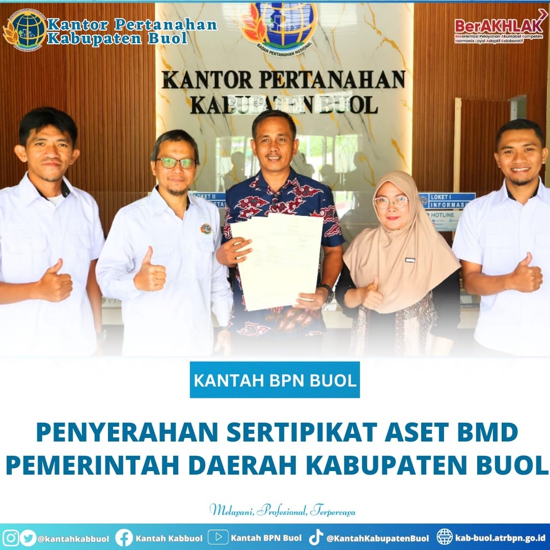 Buol, mediabusernews com. – Kamis (18/12/2025) – Kantor Pertanahan Kabupaten Buol melaksanakan penyerahan Sertipikat Aset Barang Milik Daerah (BMD) Pemerintah Kabupaten Buol sejumlah 26 bidang. Sertipikat diserahkan langsung oleh Kepala Kantor Pertanahan Kabupaten Buol, Mardianto, S.SiT.