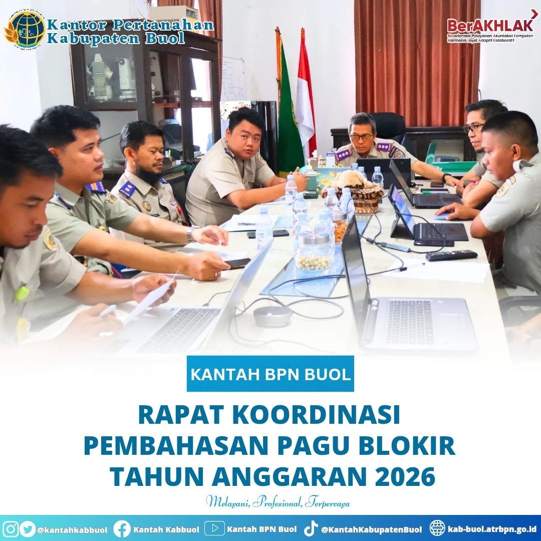 Buol, mediabusernews.com, – Selasa (16/12/2025) – Telah dilaksanakan rapat pembahasan terkait anggaran blokir untuk tahun 2026 yang bertempat di ruangan Rapat Kepala Kantor Pertanahan Kabupaten Buol.