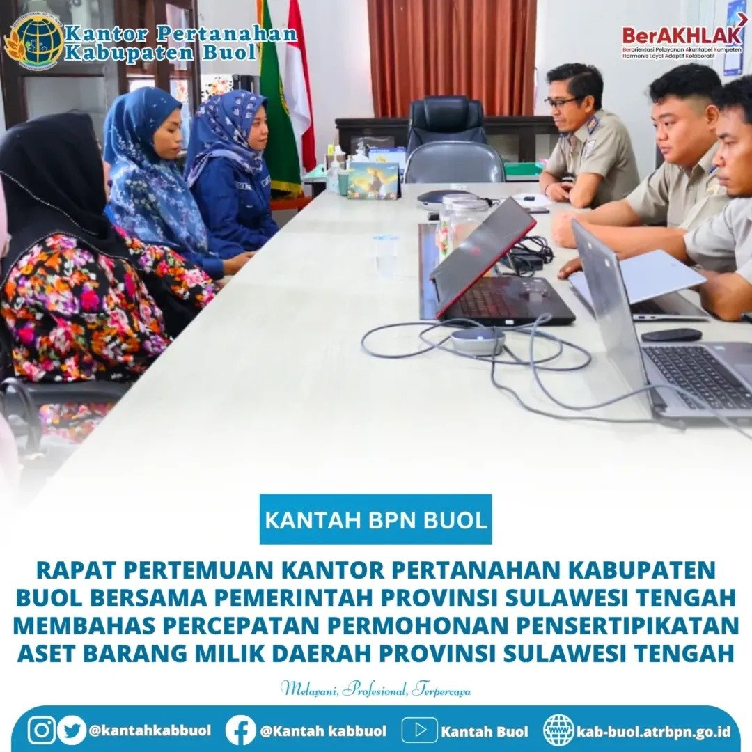 Buol, mediabusernews.com, – Selasa (18/11/25) – Kantor Pertanahan Kabupaten Buol bersama Pemerintah Provinsi Sulawesi Tengah melaksanakan rapat pertemuan dalam rangka percepatan permohonan pensertipikatan aset Barang Milik Daerah Provinsi Sulawesi Tengah.