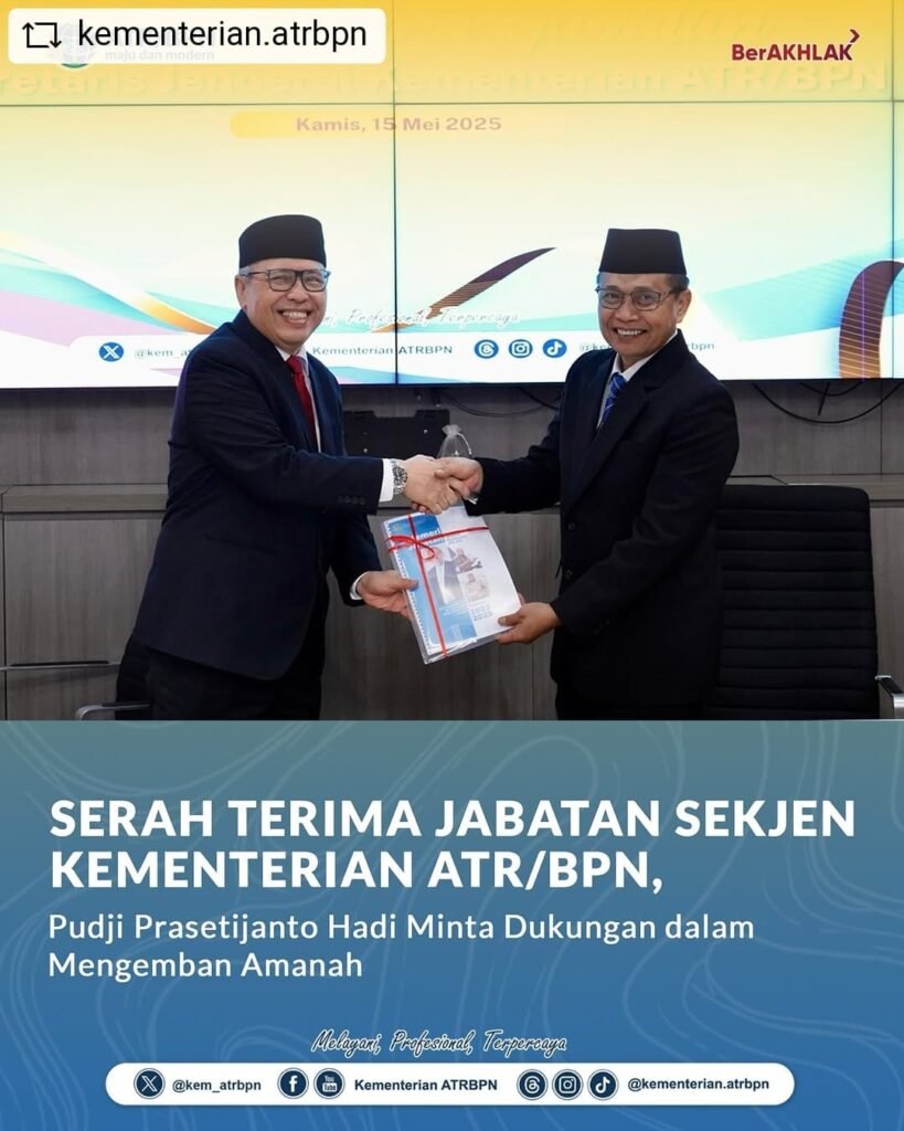 http://MediaBusernews. Com – Kementerian Agraria dan Tata Ruang/Badan Pertanahan Nasional (ATR/BPN) menggelar serah terima jabatan (Sertijab) Sekretaris Jenderal (Sekjen) pada Kamis (15/05/2025), di Kantor Kementerian ATR/BPN, Jakarta. Sertijab ini dilakukan setelah Pelantikan Pejabat Struktural terlaksana dalam hari yang sama. Sekjen terlantik, Pudji Prasetijanto Hadi, pada momen ini menyampaikan harapannya agar jajaran ikut mendukungnya dalam menjalankan tugas baru di lingkup pertanahan dan tata ruangβKementerian ATR/BPN ini adalah ruang yang baru bagi saya, karena selama ini saya berfokus di bagian penegakan hukum. Mohon dukungannya dari Bapak/Ibu semuanya,β ujar Pudji Prasetijanto Hadi dalam sambutannya.#KementerianATRBPN#MelayaniProfesionalTerpercaya#MajuDanModern#MenujuPelayananKelasDunia