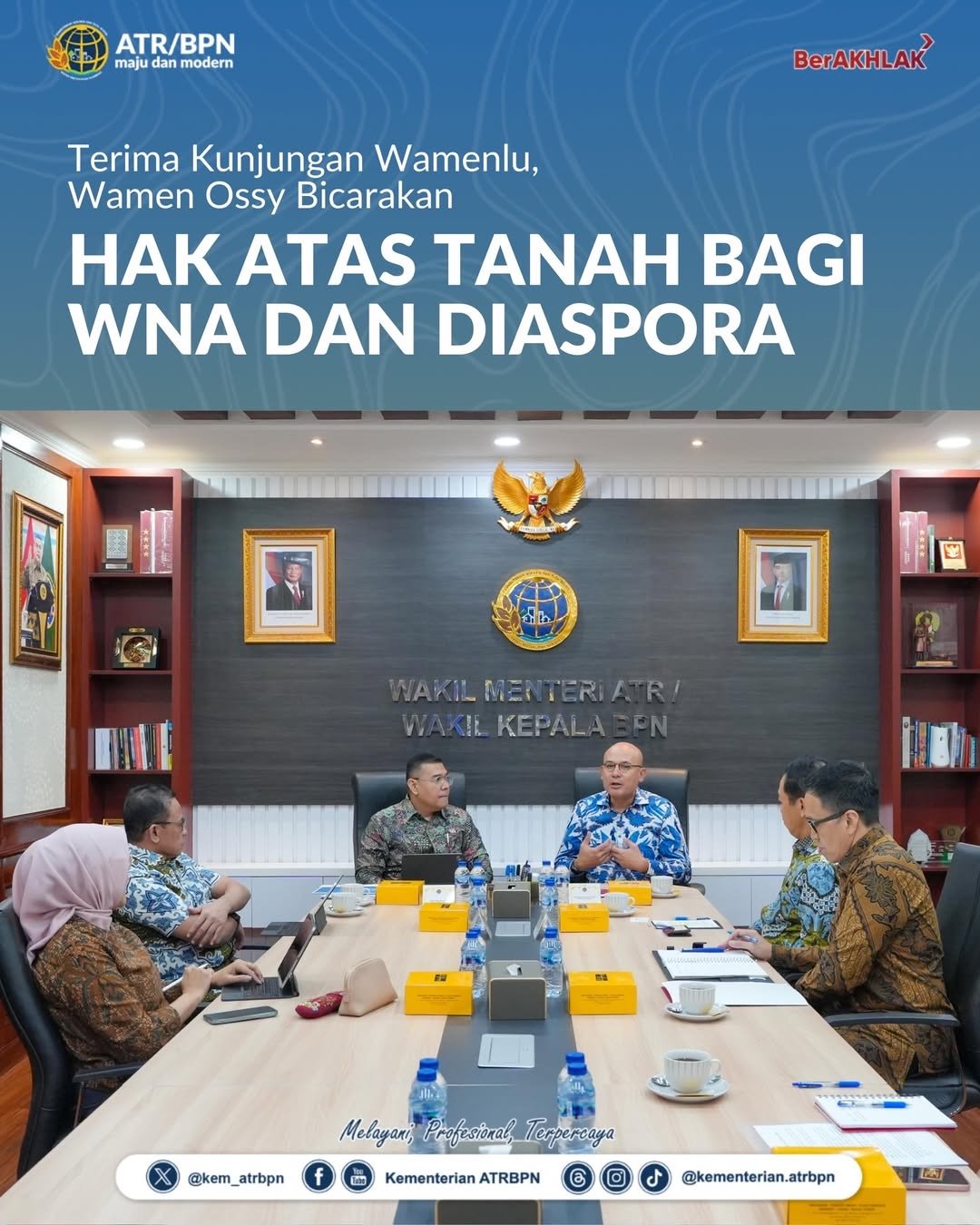 Jakarta, mediabusernews.com, – Wakil Menteri Agraria dan Tata Ruang/Wakil Kepala Badan Pertanahan Nasional (Wamen ATR/Wakil Kepala BPN), Ossy Dermawan, menerima kunjungan Wakil Menteri Luar Negeri (Wamenlu), Arrmanatha Christiawan Nasir, beserta jajaran di Kementerian ATR/BPN, Jakarta, Jumat (09/01/2026). Pertemuan tersebut membahas terkait pengelolaan hak atas tanah yang dimiliki warga negara asing (WNA) dan diaspora.