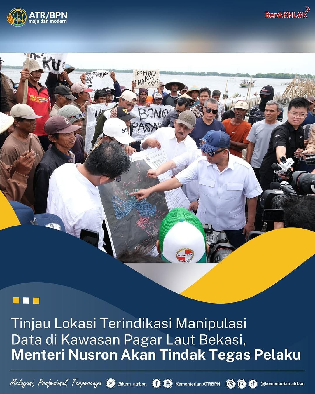 Bekasi, Media Buser News.com, – Menteri Agraria dan Tata Ruang/Kepala Badan Pertanahan Nasional (ATR/BPN), Nusron Wahid meninjau lokasi terbitnya Sertipikat Hak Guna Bangunan (HGB) di atas laut yang berada di Kabupaten Bekasi, Selasa (04/02/2025). Ia mengungkapkan adanya indikasi manipulasi data terkait bidang tanah yang tercatat di wilayah tersebut. Berdasarkan pengamatan langsung, ditemukan ketidaksesuaian antara data peta bidang tanah yang tercatat dengan kondisi sebenarnya.